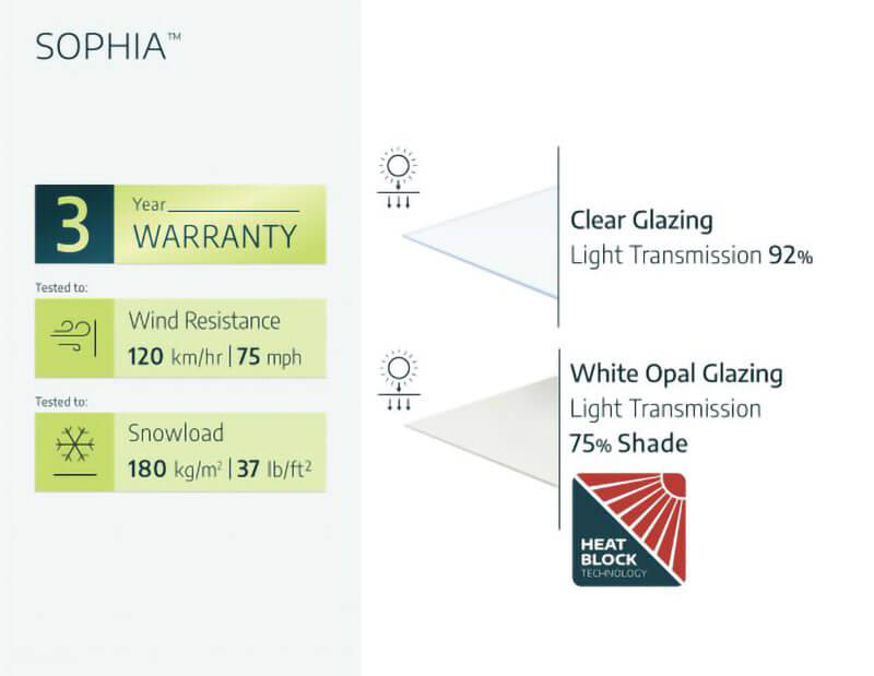 A minőségi anyagokból készült masszív Palram Sophia 2150 és Sophia 1600 modern és letisztult formájával esztétikusan emeli a homlokzat fényét. Könnyen és egyszerűen összeszerelhető és szerelhető a mellékelt szerelvényekkel. Rendkívül tartós és masszív lombkorona. Minden évszakban védi a bejáratot az időjárástól. Az erős, strapabíró és átlátszó 4 mm-es tetőpanel ellenáll a káros UV sugárzásnak. Erős alumínium profilok és horganyzott acél tartókonzolok porszórt bevonattal, sötétszürke színben. Csavar nélküli tetőszerkezet, amelyet kifejezetten az eső/harmatszivárgás megelőzésére fejlesztettek ki.